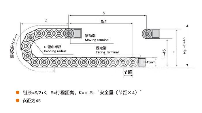 拖鏈長度確定公式:L=LA/2+b+DPJ ( L=拖鏈長度   LA/2=1/2行程  b=曲線長度 )