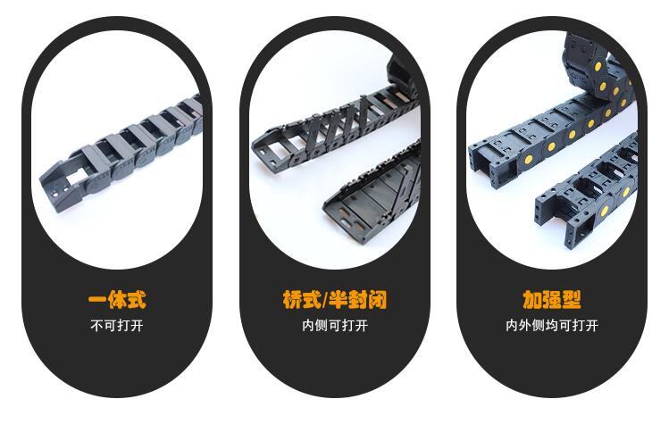 TL塑料拖鏈分為一體式(不可打開)、橋式/半封閉(內側可打開)和加強型(內外側均可打開)三種。